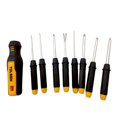 Xem chi tiết đầy đủBộ tua vít 8 trong 1 TOLSEN 20039 _______________________________ Gồm có: - 3 đầu vít dẹp: 3x60mm | 5x60mm | 6x60mm - 3 đầu vít bake: PH0x60mm | P...