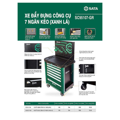 Xem chi tiết đầy đủXe đẩy dụng cụ 7 ngăn SATA SC95107-GR ___________________________ Thông số kỹ thuật - Chiều dài: 918mm - Chiều rộng: 534mm - Chiều cao: 1556mm - Kí...