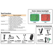 ‣ Phụ kiện đi kèm: Dây nguồn (7277), Dây thử nghiệm với kẹp cá sấu (7129A), Que thử phẳng (7161A), Bộ chuyển đổi cho dây nối dài (7276), Hộp đựng (9193), Dây đeo vai (9121), Hướng dẫn sử dụng