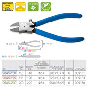 Kìm cắt nhựa mép lưỡi phẳng và mỏng, kích thước từ 150mm-200mm, Fujiya 90AS series. có lò xo trợ lực và vít chặn, chuẩn RoHS. Xuất xứ Nhật bản